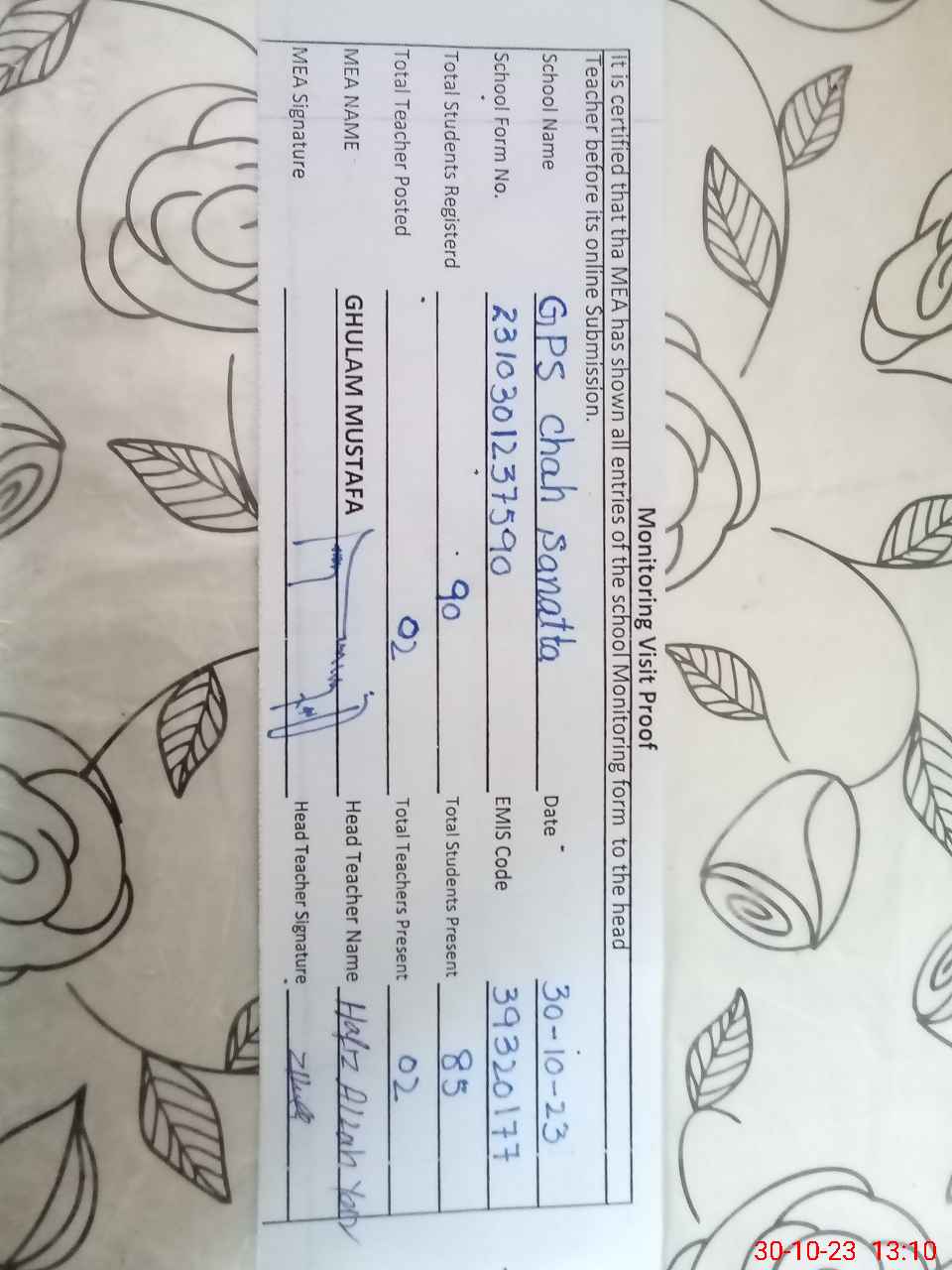 | Attendance Register | Head Teacher | MEA with School | Visit Proof |