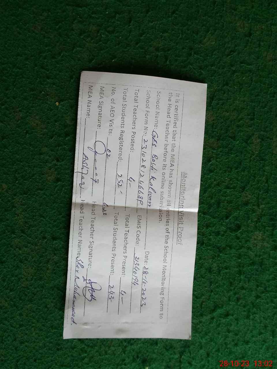 | Attendance Register | Head Teacher | MEA with School | Visit Proof |