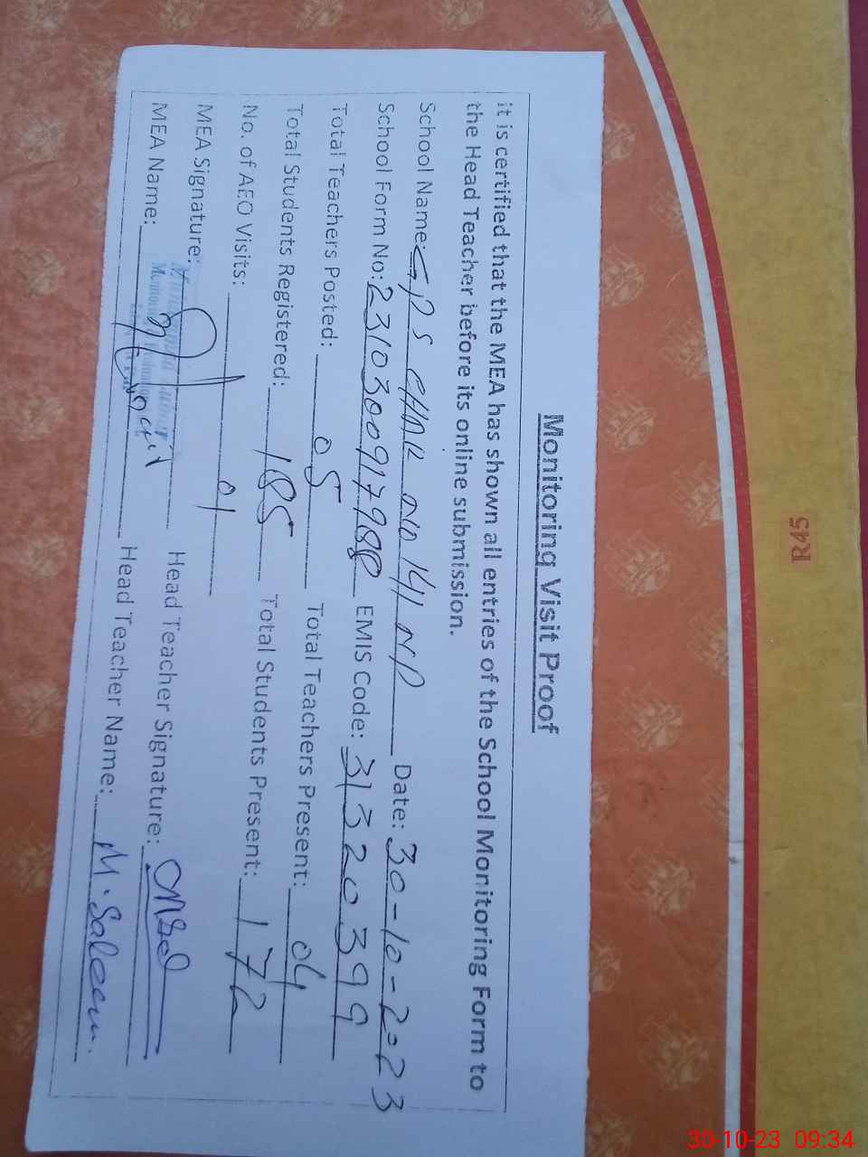 | Attendance Register | Head Teacher | MEA with School | Visit Proof |