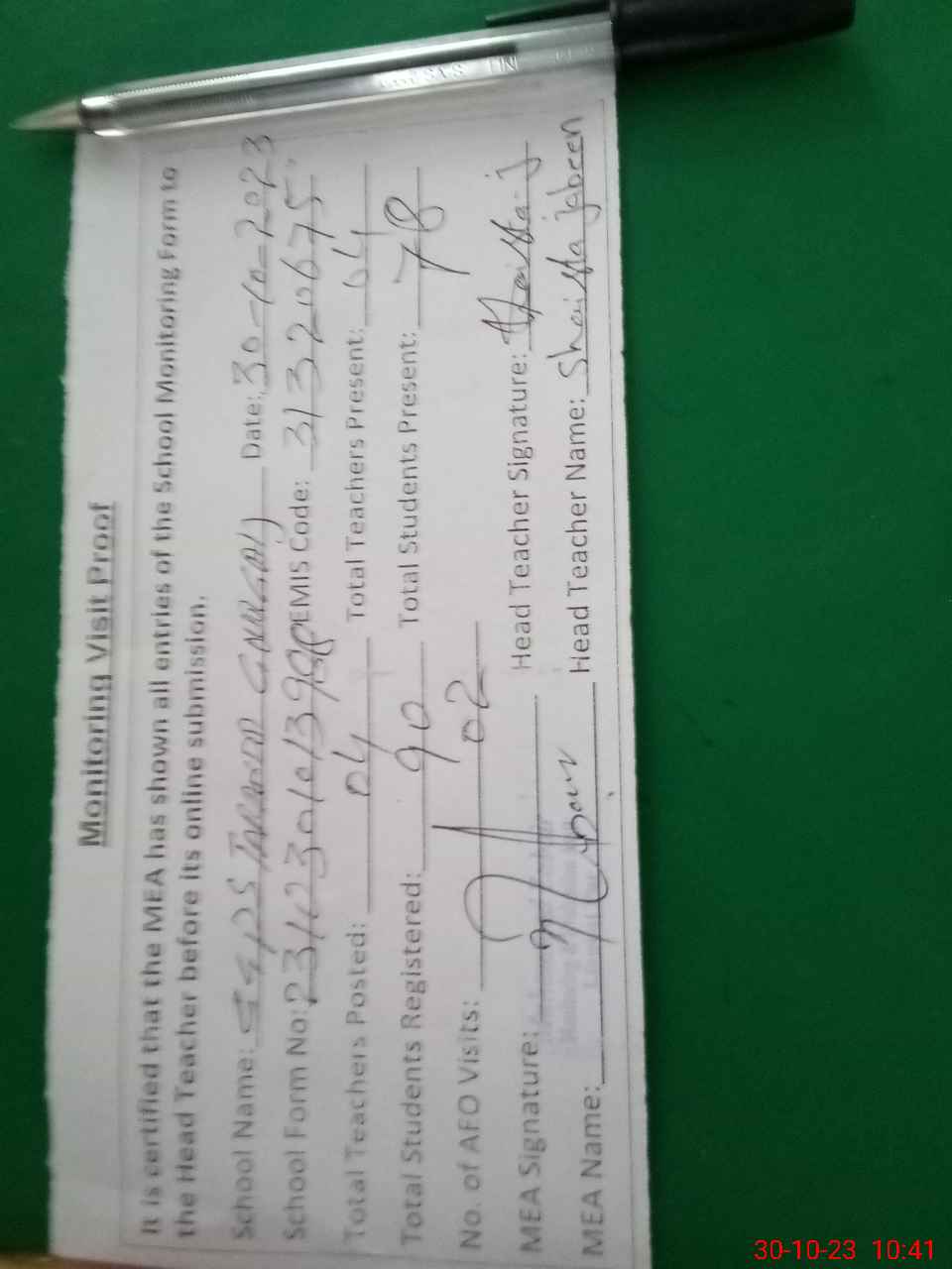 | Attendance Register | Head Teacher | MEA with School | Visit Proof |