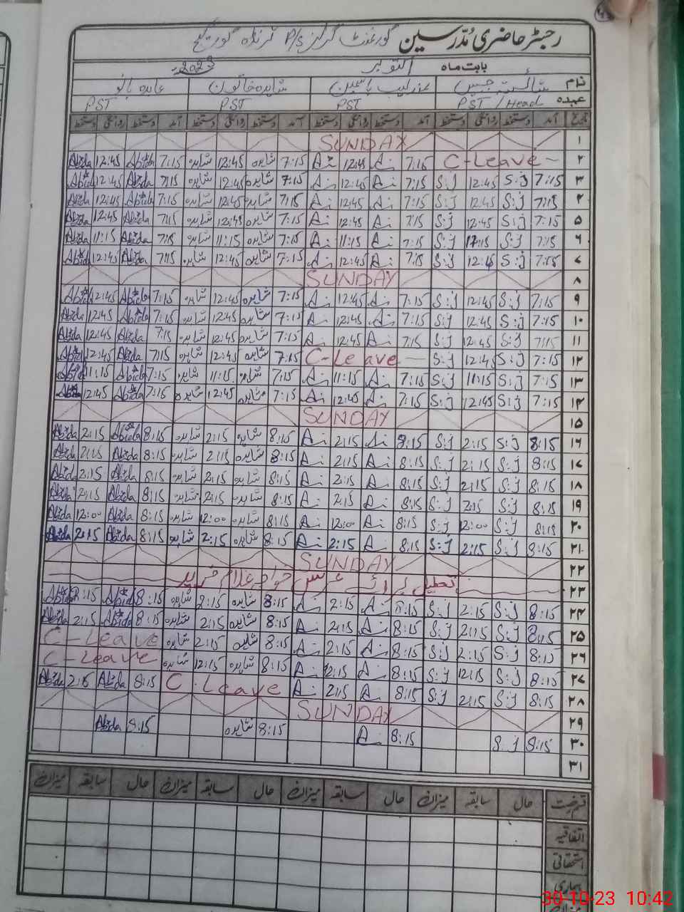 | CNIC | Full Name | Designation | R/C | Absence During Last Calender Month |