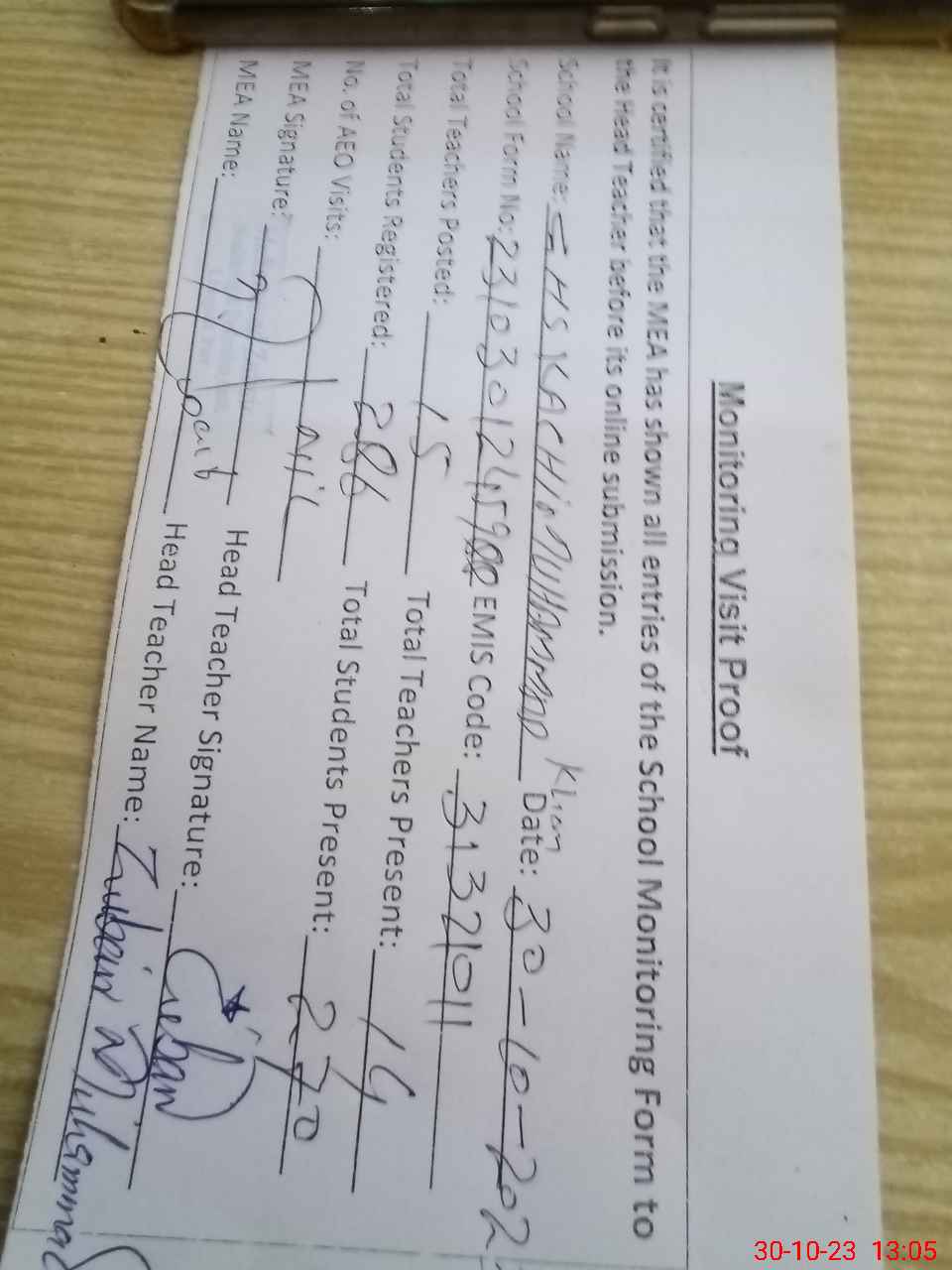 | Attendance Register | Head Teacher | MEA with School | Visit Proof |