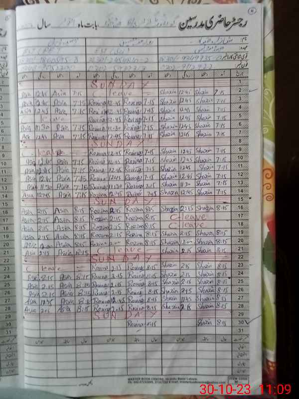 | Total no. of Classrooms: 10 No. of Classrooms Used for Teaching: 9 No. of Classrooms Storing Old Furniture, FTBs, etc: 0Comments if Any: PET Asia Bibi was absent her leave record was not available and not shown to MEA during visit |