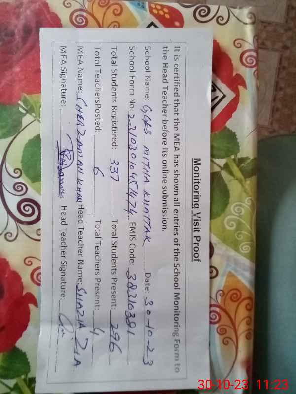 | EMIS Code: 38310381 | Name of School: GGES MITHA KHATTAK | |||
