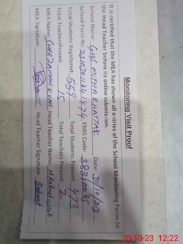 | EMIS Code: 38310045 | Name of School: GHS MITHA KHATAK | |||