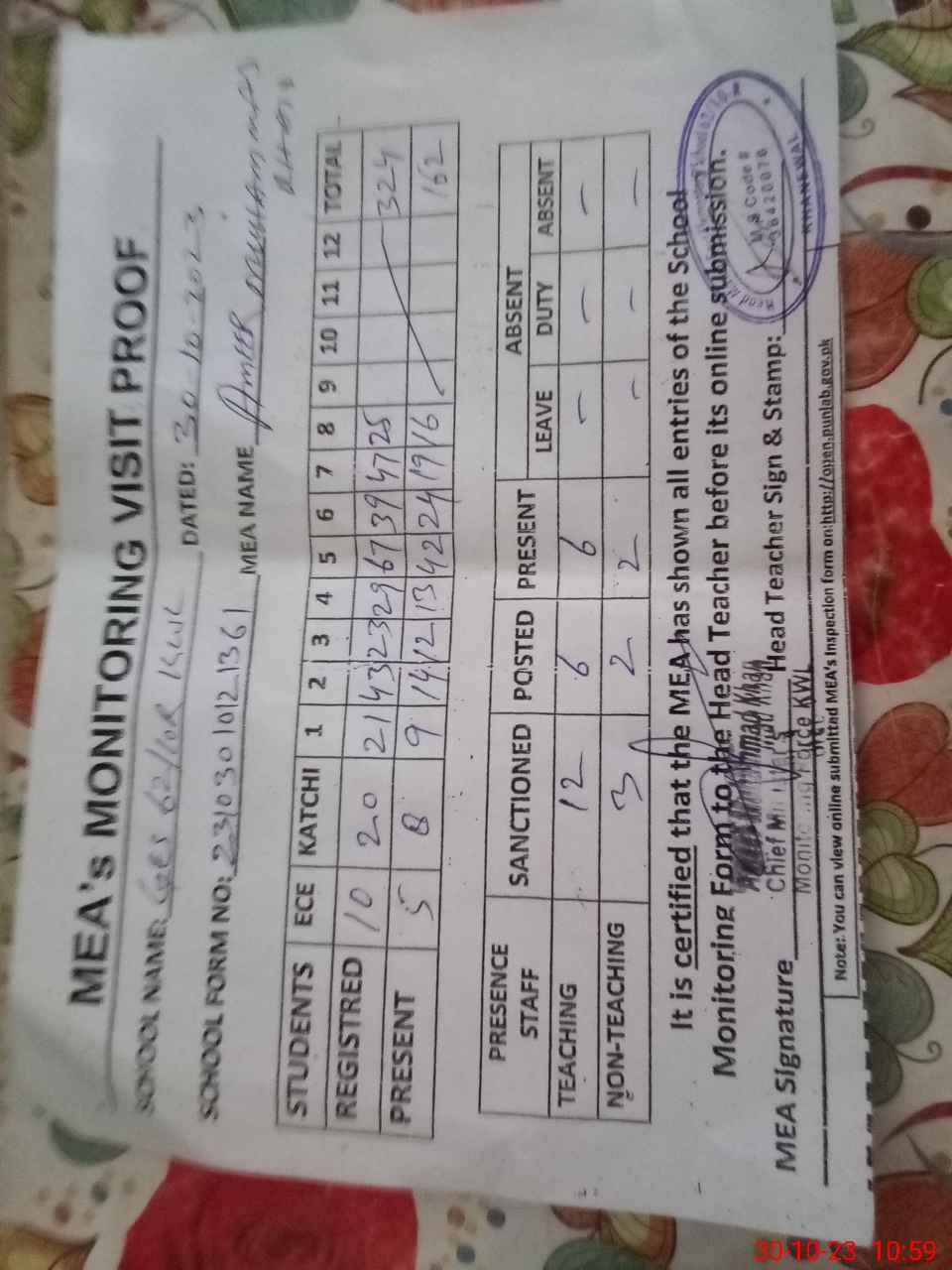 | Attendance Register | Head Teacher | MEA with School | Visit Proof |