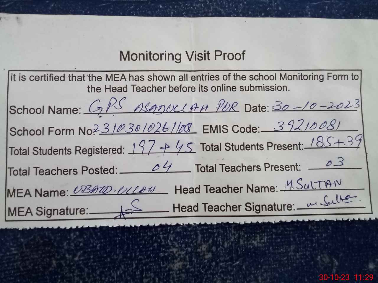 | Attendance Register | Head Teacher | MEA with School | Visit Proof |