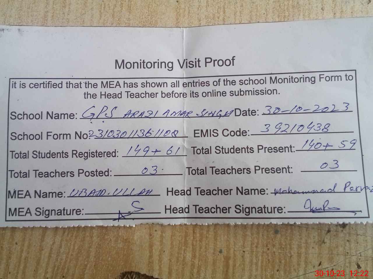 | EMIS Code: 39210438 | Name of School: GPS ARAZI AMAR SINGH | |||