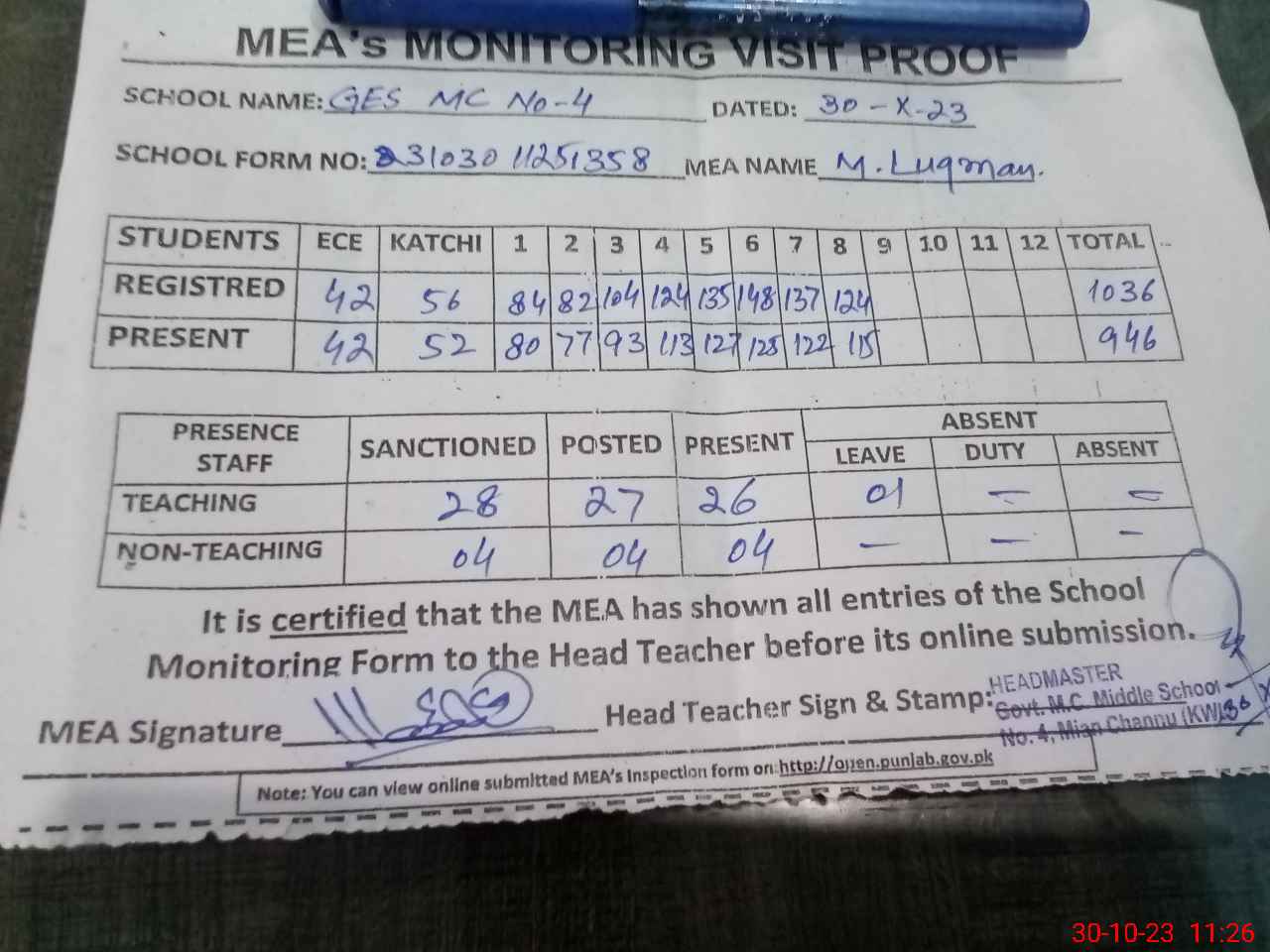| Attendance Register | Head Teacher | MEA with School | Visit Proof |
