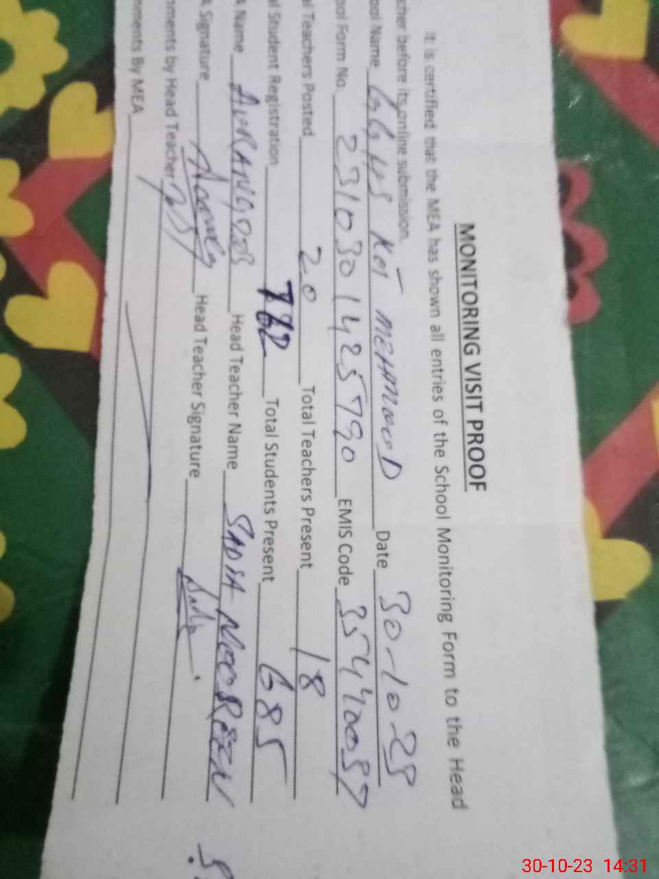 | Attendance Register | Head Teacher | MEA with School | Visit Proof |