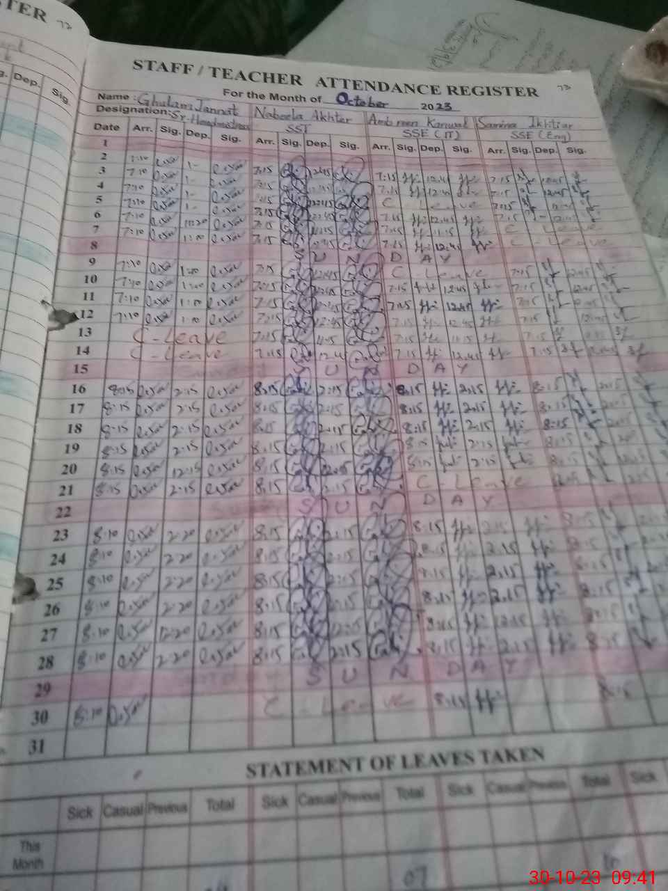 | 37**** | Na**** Ta**** | 2 | 0 | 0 | 30 | 0 | 0 | 0 | 0 | 0 | 0 | Absent (Un-Authorized) | |