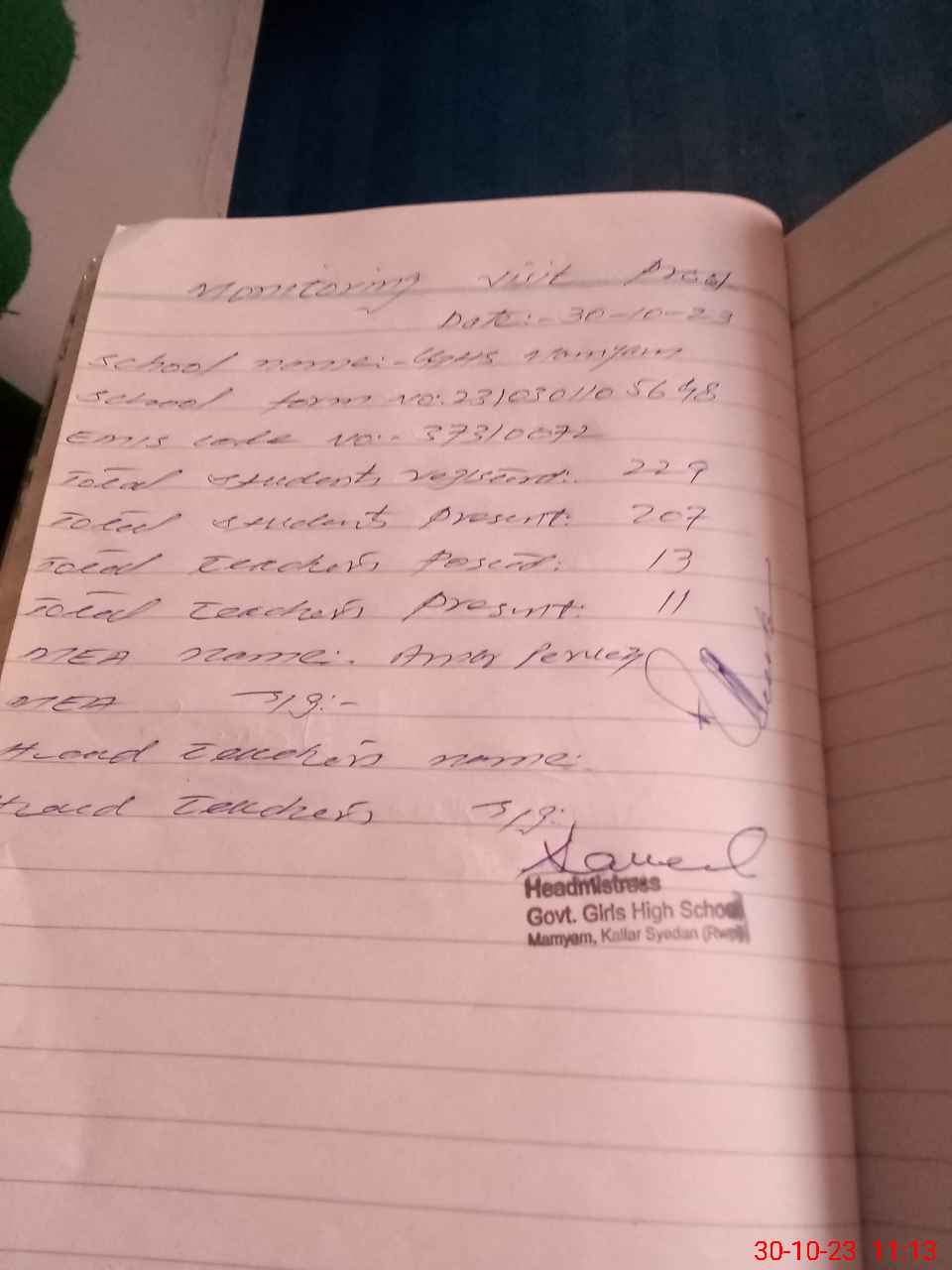 | Attendance Register | Head Teacher | MEA with School | Visit Proof |