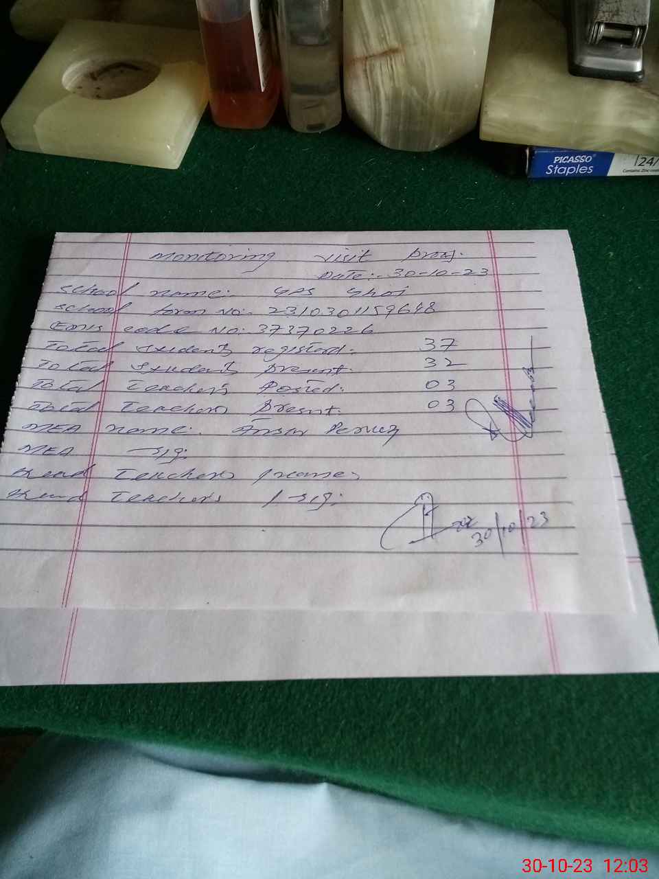 | Attendance Register | Head Teacher | MEA with School | Visit Proof |