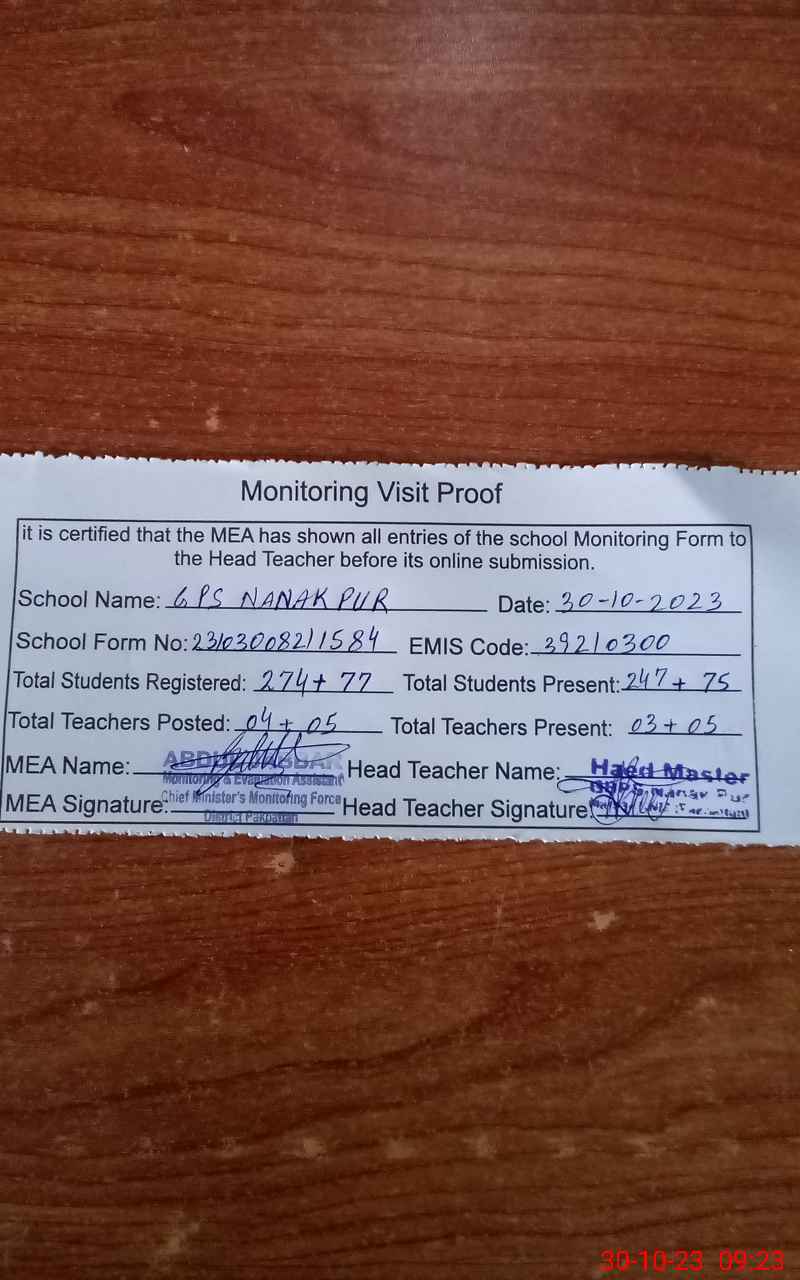 | EMIS Code: 39210300 | Name of School: GES NANAK PUR | |||