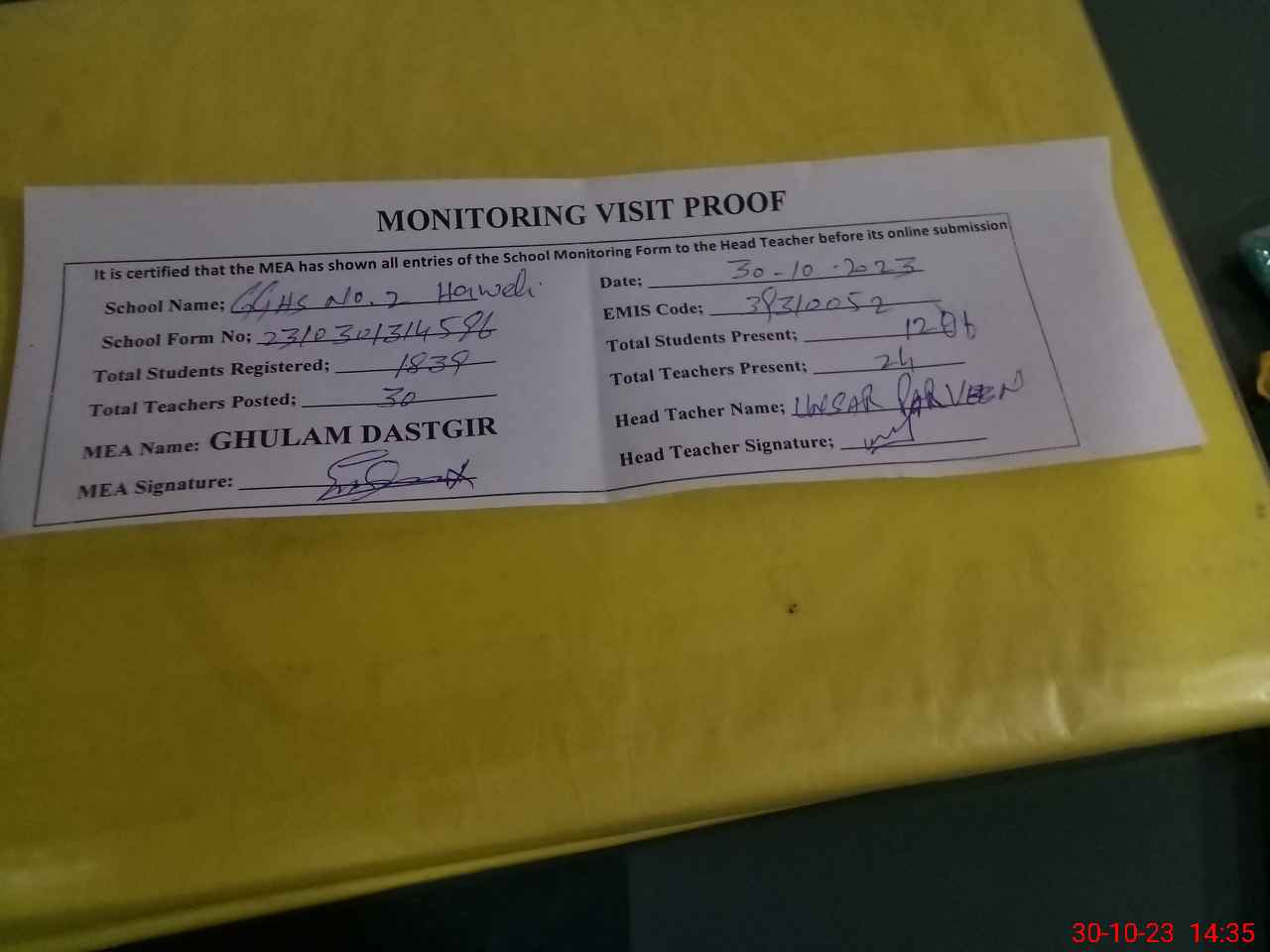 | Attendance Register | Head Teacher | MEA with School | Visit Proof |