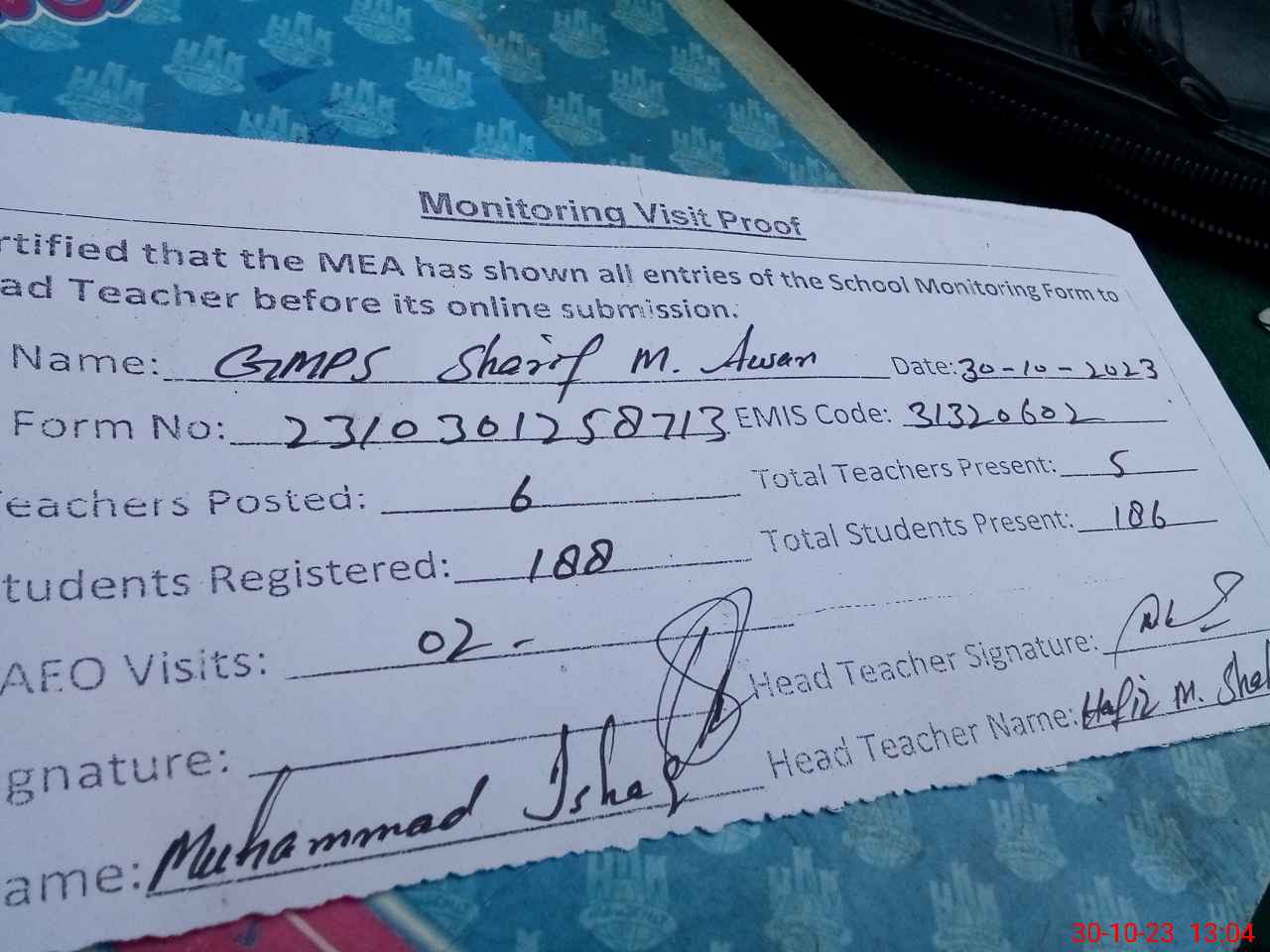 | Name: HA**** MU**** SH**** I'**** Designation: (School Headmaster's/Headmistress's) PST/PTC/JV Phone/Cell Number: 03**** |
