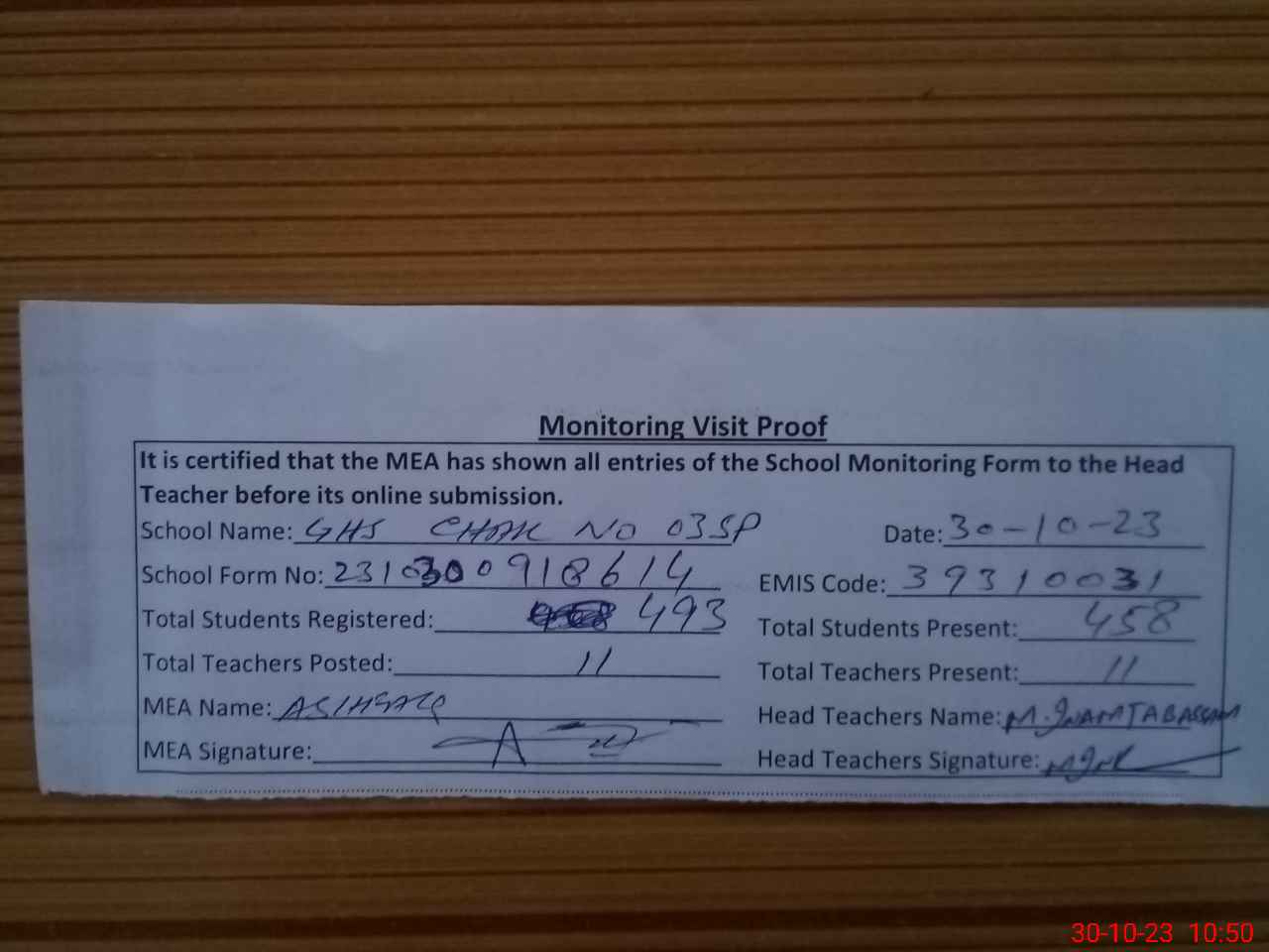 | Attendance Register | Head Teacher | MEA with School | Visit Proof |