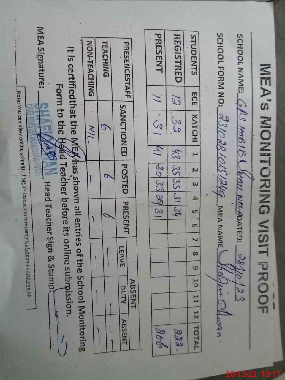 | Certified that this School was Inspected by the Undersigned MEA/DMO Today and the Information Stated Above is as Per Record. | |||||