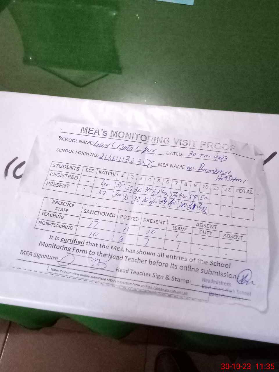 | Attendance Register | Head Teacher | MEA with School | Visit Proof |
