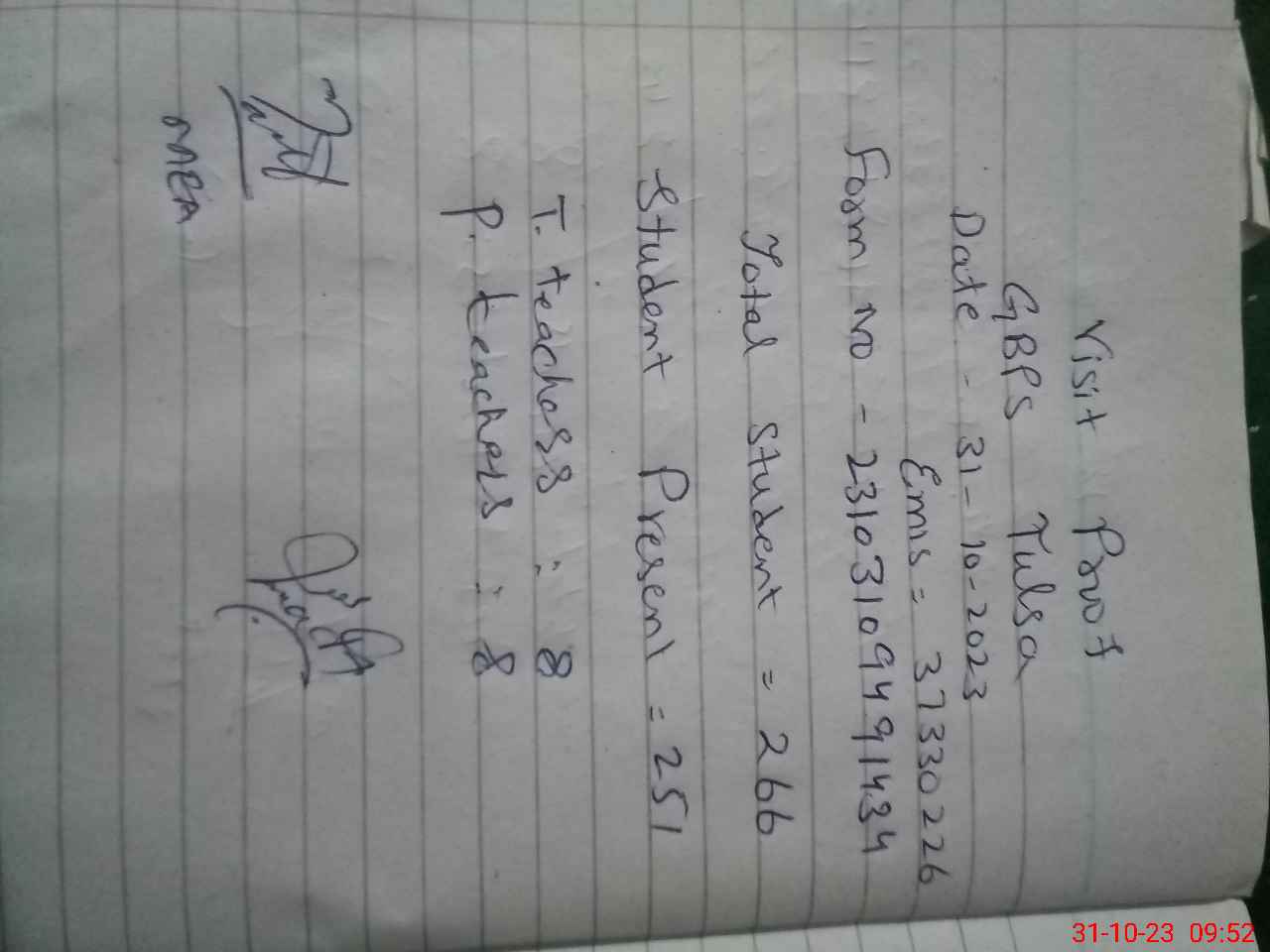 | Attendance Register | Head Teacher | MEA with School | Visit Proof |