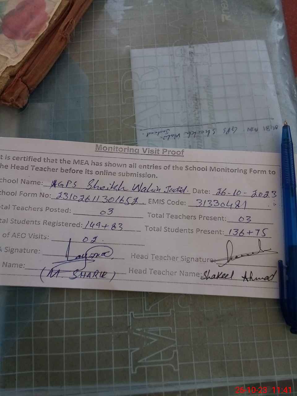 | Attendance Register | Head Teacher | MEA with School | Visit Proof |