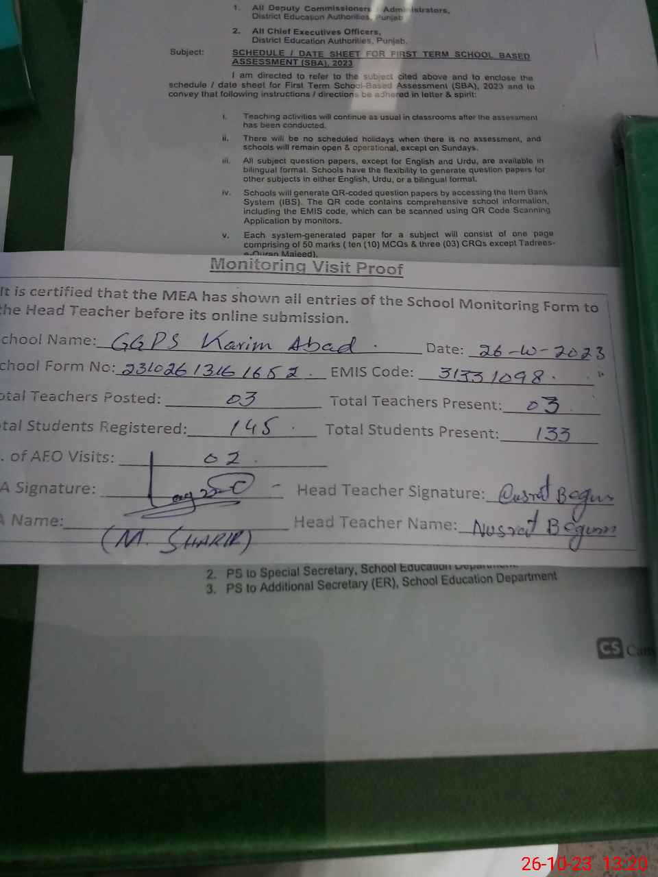 | Certified that this School was Inspected by the Undersigned MEA/DMO Today and the Information Stated Above is as Per Record. | |||||