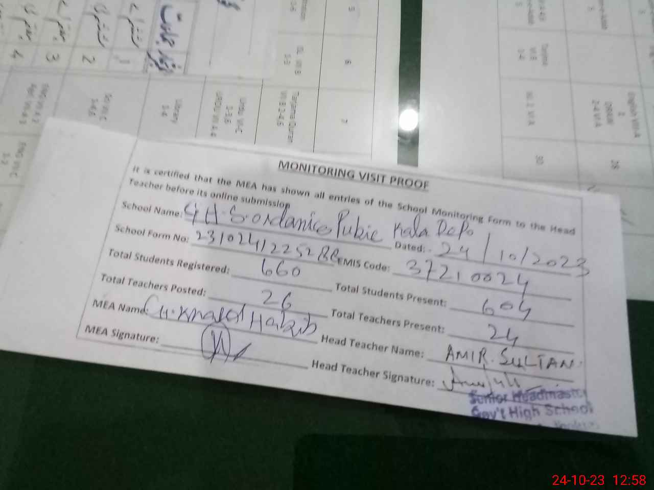 | Certified that this School was Inspected by the Undersigned MEA/DMO Today and the Information Stated Above is as Per Record. | |||||