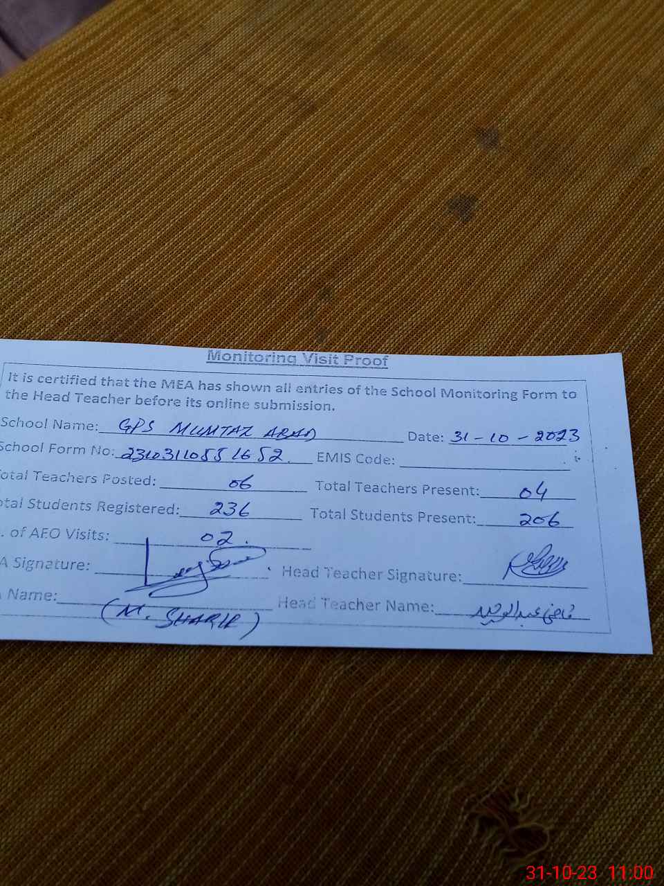| EMIS Code: 31331005 | Name of School: GPS MUMTAZ ABAD | |||