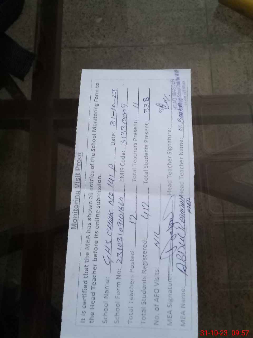 | Attendance Register | Head Teacher | MEA with School | Visit Proof |