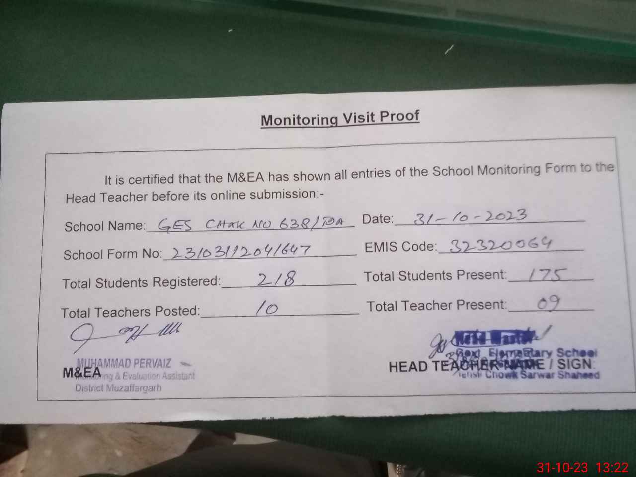 | Attendance Register | Head Teacher | MEA with School | Visit Proof |