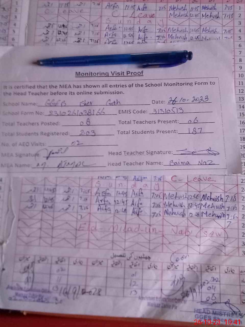 | Attendance Register | Head Teacher | MEA with School | Visit Proof |