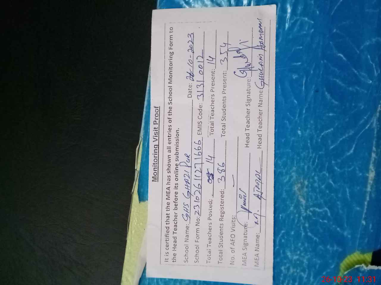 | Attendance Register | Head Teacher | MEA with School | Visit Proof |