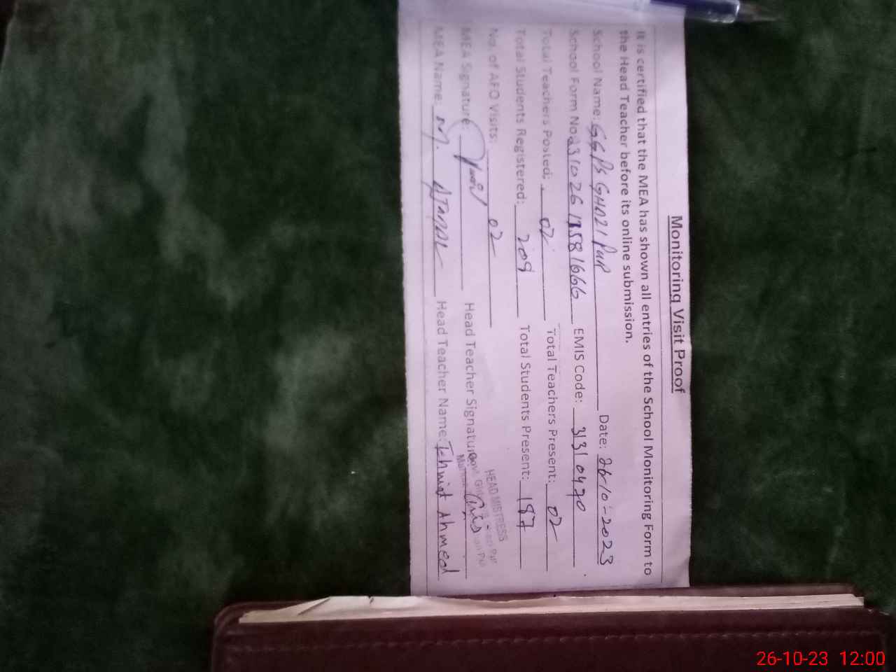 | Monitoring Date: 26-10-2023 | Start Time: 26-10-2023 11:32 AM | End Time: 26-10-2023 12:00 PM | Name of MEA: Mu**** Aj**** | |