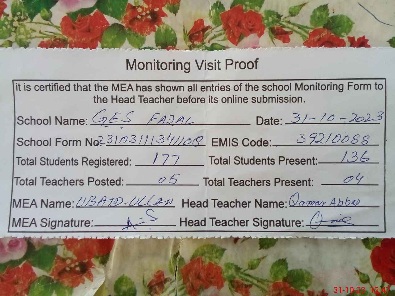 | Attendance Register | Head Teacher | MEA with School | Visit Proof |