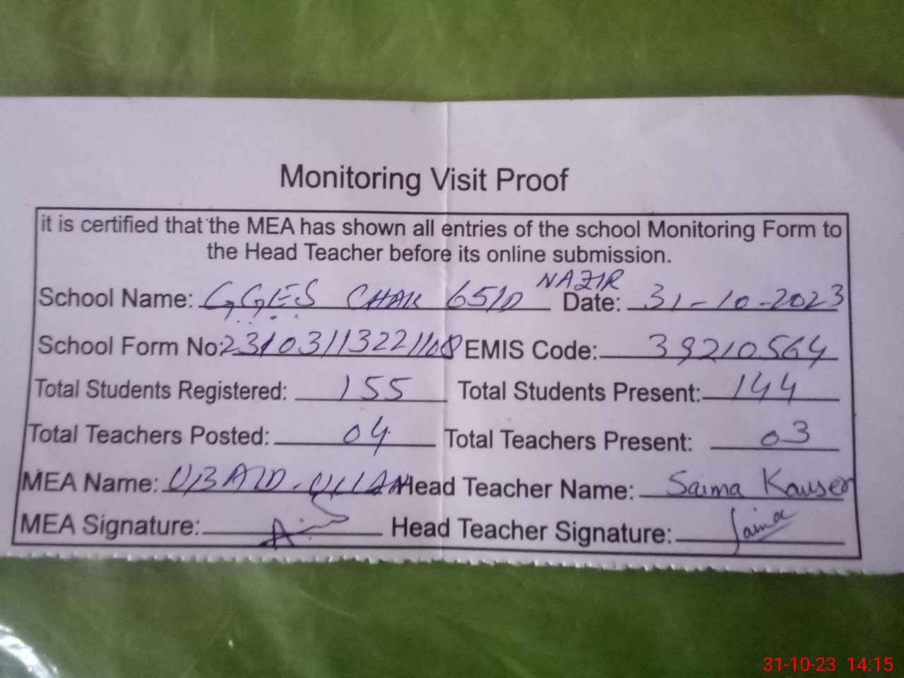 | Attendance Register | Head Teacher | MEA with School | Visit Proof |
