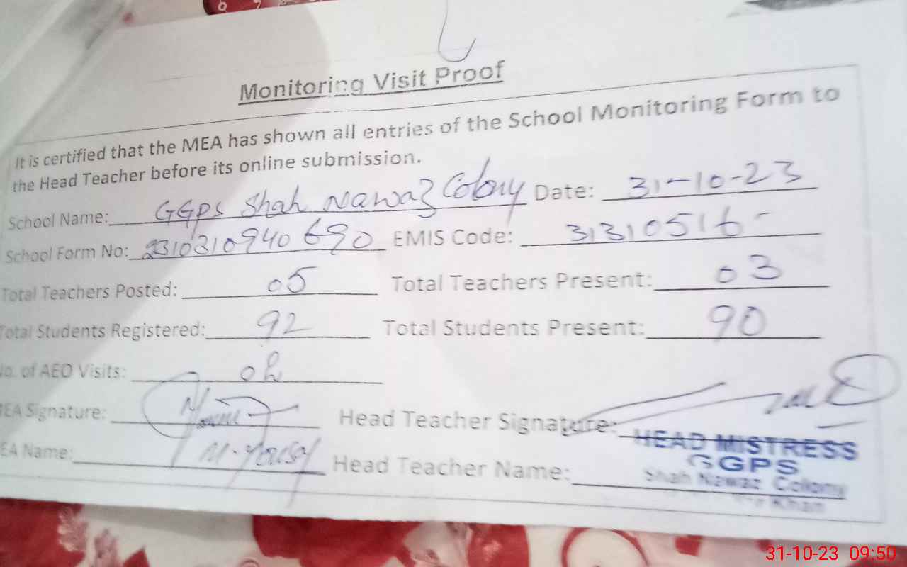 | EMIS Code: 31330516 | Name of School: GGPS SHAH NAWAZ COLONY | |||