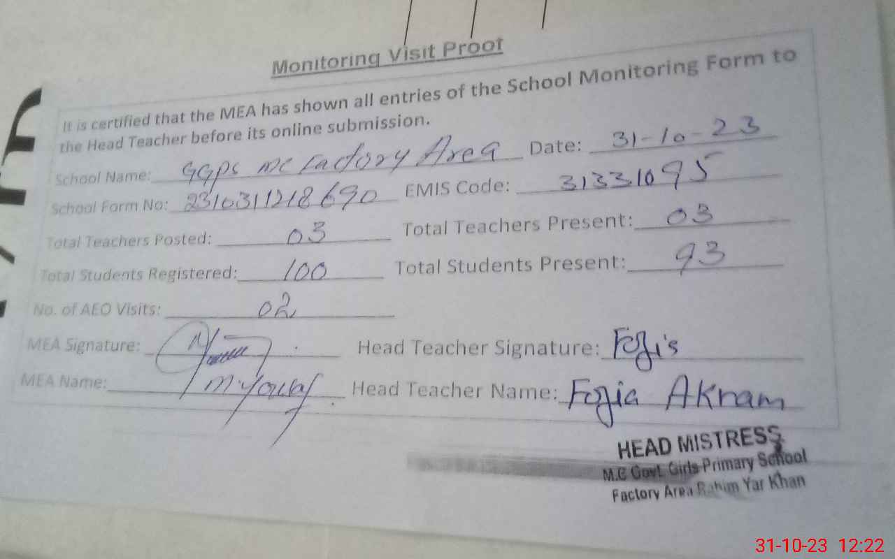 | Attendance Register | Head Teacher | MEA with School | Visit Proof |