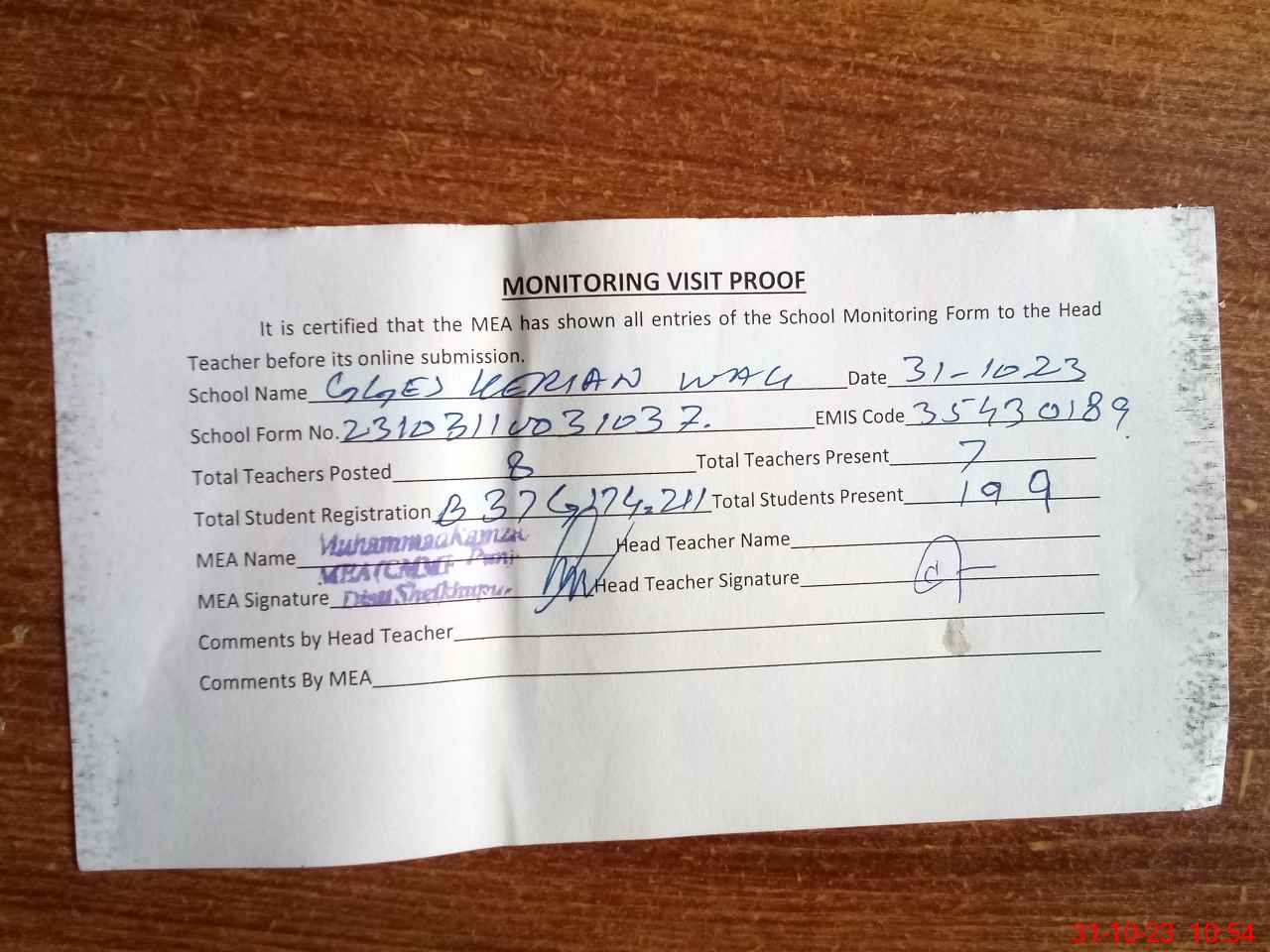 | Attendance Register | Head Teacher | MEA with School | Visit Proof |