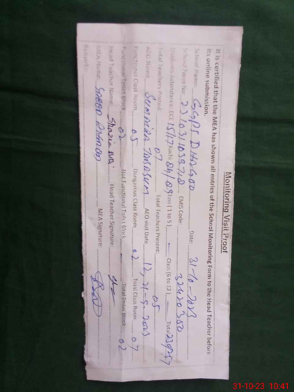 | Certified that this School was Inspected by the Undersigned MEA/DMO Today and the Information Stated Above is as Per Record. | |||||