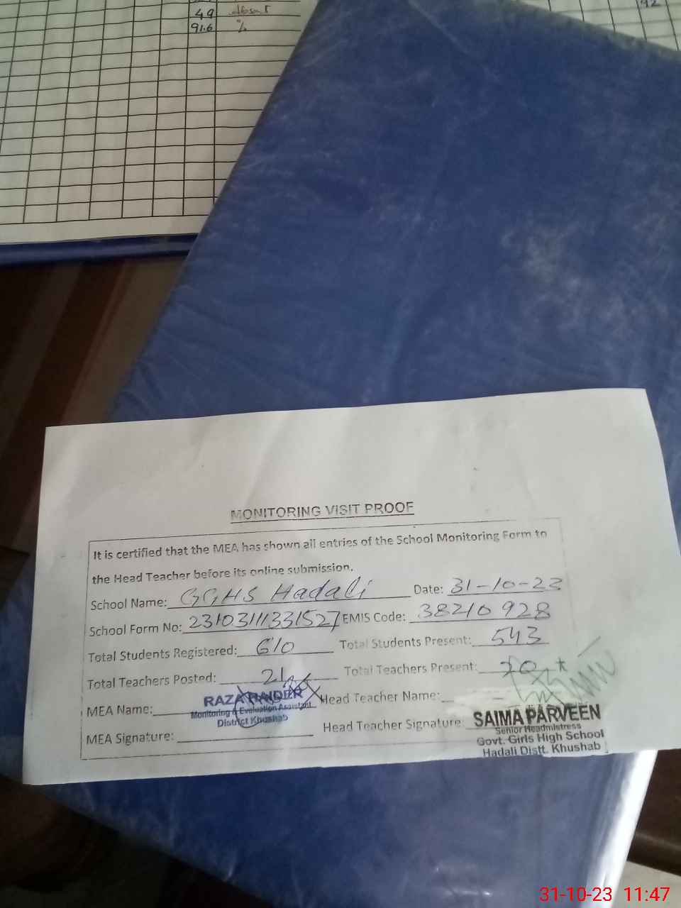 | Attendance Register | Head Teacher | MEA with School | Visit Proof |