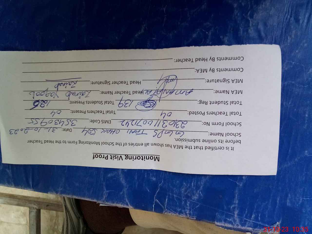 | Attendance Register | Head Teacher | MEA with School | Visit Proof |
