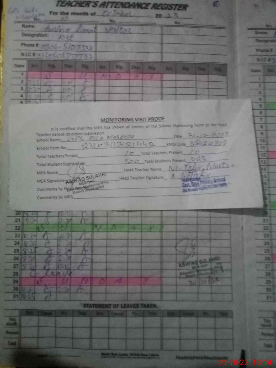 | Attendance Register | Head Teacher | MEA with School | Visit Proof |