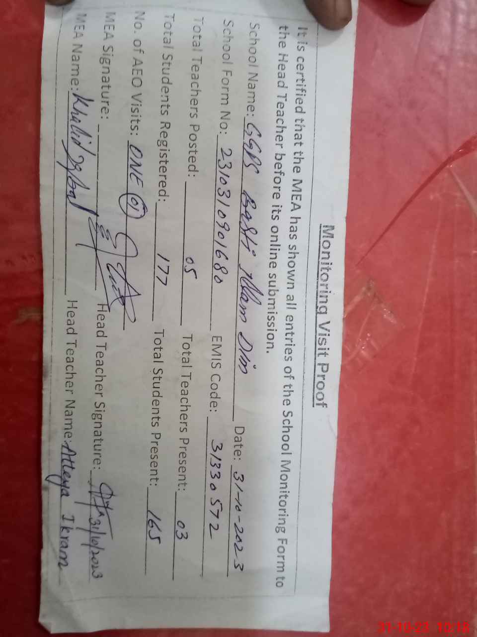 | Remarks (Use Separate Page if Required): Class verification is not updated on MEA tab as per sis and school is running in private building which consists of four classrooms | |||||