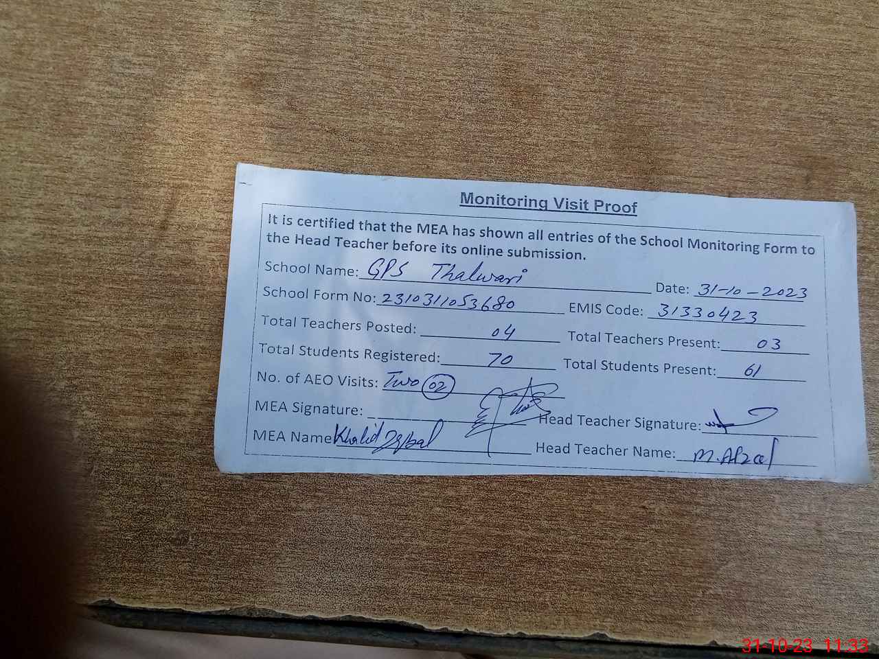 | EMIS Code: 31330423 | Name of School: GPS THALWARI | |||