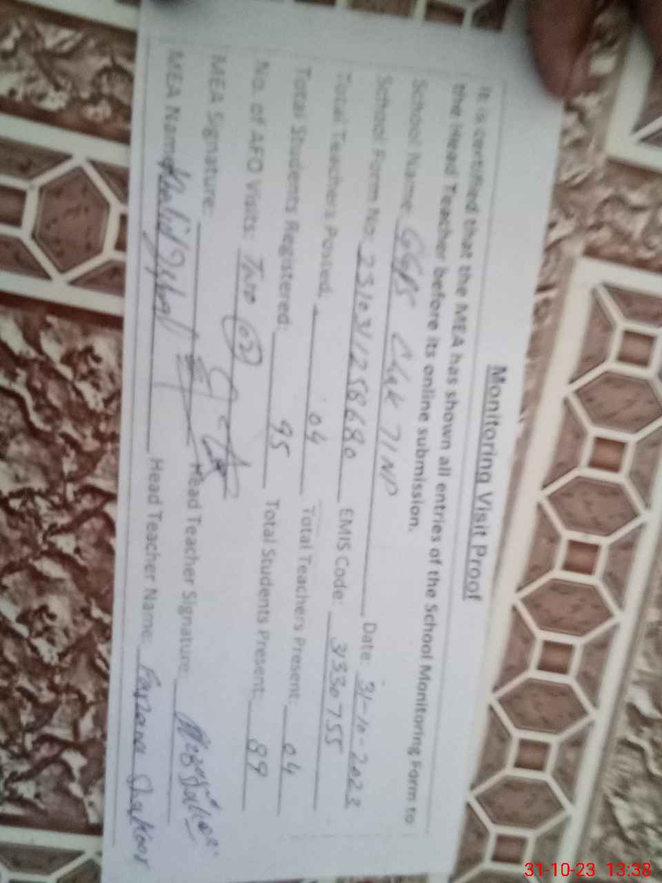 | Attendance Register | Head Teacher | MEA with School | Visit Proof |