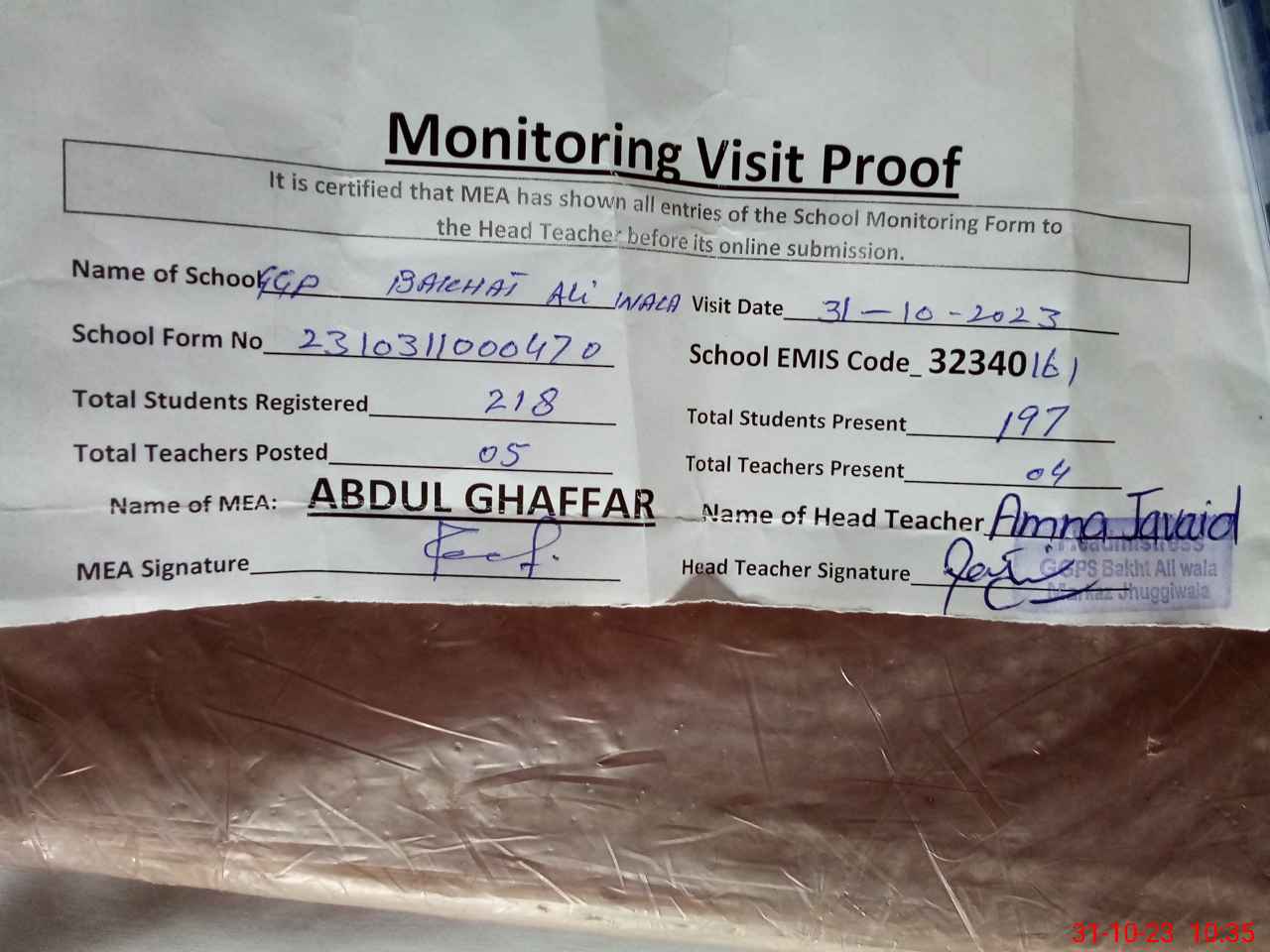 | EMIS Code: 32340161 | Name of School: GGPS BAKHAT ALI WALA | |||