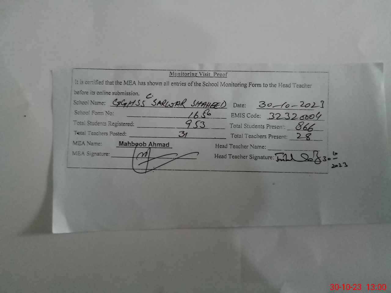 | Attendance Register | Head Teacher | MEA with School | Visit Proof |