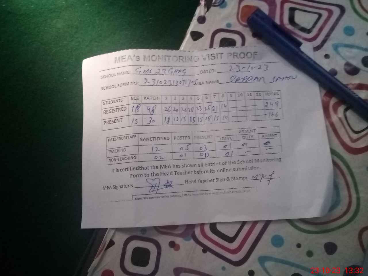 | Attendance Register | Head Teacher | MEA with School | Visit Proof |