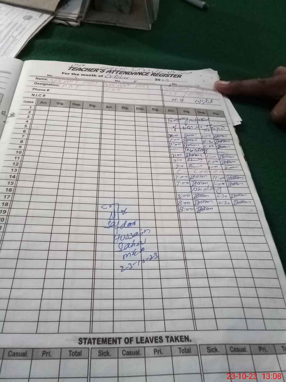 | 35**** | Ab**** Gh**** | 5 | 1 | 0 | 0 | 0 | 0 | 0 | 0 | 0 | 0 | 0 | Exam Duty |