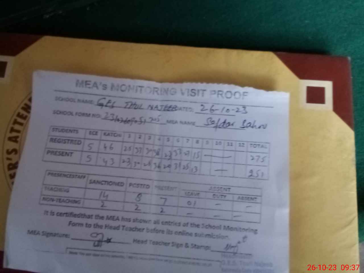 | Attendance Register | Head Teacher | MEA with School | Visit Proof |